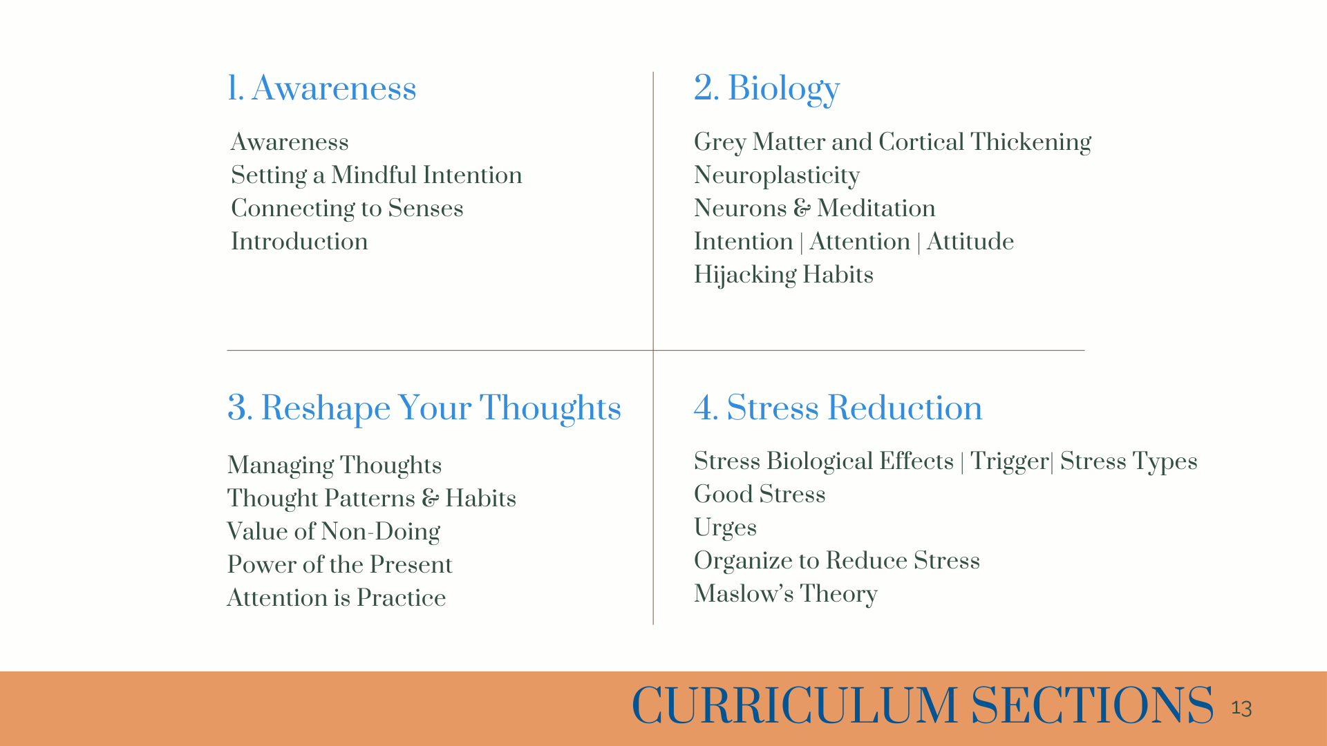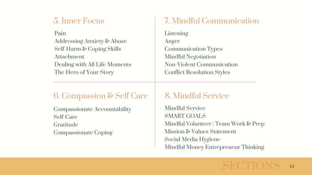 13. Rewriting one’s story, working on self-love, self-advocacy, and increasing self-reliance. This comprehensive curriculum guides participants through a transformative journey of self-discovery, equipping them with the tools and insights to lead a more mindful, fulfilling, and authentic life.